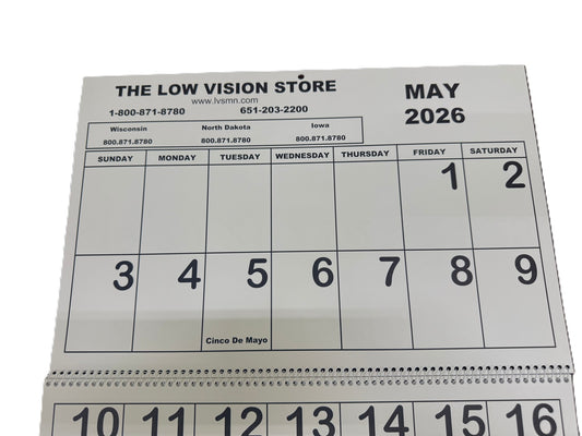 2026 Jumbo Low Vision Calendar Stay organized with our best-selling Jumbo Calendar, designed for individuals with low vision. Large Format: Measures 17” wide by 22” open Bold Numbers: Numbers measure a full 1” high for easy reading High Contrast: Big, bold print on both numbers and letters Accessible Design: Perfect...